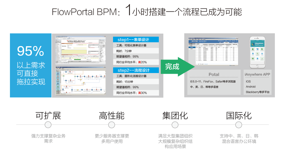 FlowPortal. net具有方便、易用和可擴展的特性,一方面在FlowPortal. net中流程、表單、報表一切設計皆是可視化免編程的,另一方面FlowPortal. net采用微軟.net技術做為流程和表單的基礎技術,具有良好的開放性、可擴展性和彈性,是企業進行業務流程管理的理想戰略平臺。